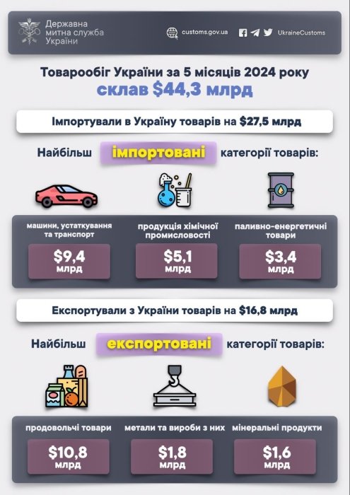 Протягом січня-травня 2024 року в Україну імпортували товарів на суму 27,5 млрд доларів, а експортували – на 16,8 млрд доларів.