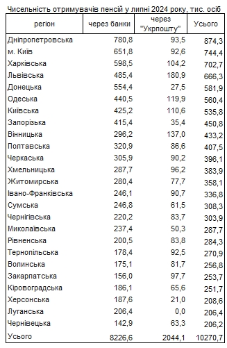 Станом на 1 серпня 2024 року загальна чисельність пенсіонерів в Україні становила 10,271 млн осіб, що на 26,2 тисяч більше, ніж місяць тому.