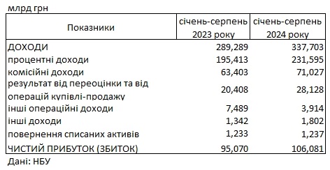 За даними НБУ, доходи банків за січень-серпень 2024 року зросли на 16,7% до 337,7 млрд гривень, при цьому процентні доходи зросли на 18,5% до 231,6 млрд гривень.