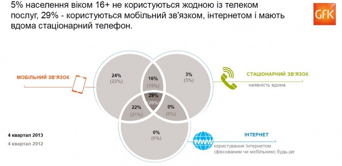 Согласно исследованию, часть пользователей мобильной связи по результатам четвертого квартала 2013 года составляла 91% украинцев в возрасте 16 лет и старше.