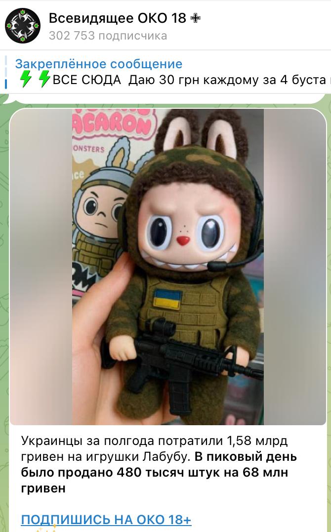 Телеграм-канал «Всевидюче Око 18+», який офіційно записаний на Тетяну Снопко, повʼязану зі скандальним бізнесменом Максимом Кріппою, вчергове видав фейк. Він повідомив, що українці за пів року витратили 1,58 млрд грн на іграшки Labubu, а в один день купили 480 тис. штук. Але насправді це — статистика продажів іграшок Labubu у Росії. Саме російські ЗМІ 20 липня написали, що росіяни витратили 1,58 млрд рублів на цю іграшку, а в піковий день придбали 480 тис. екземплярів. Це легко перевірити за допомогою Google-пошуку.