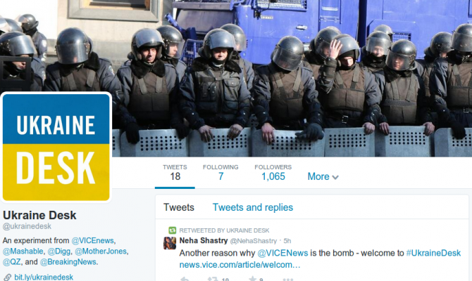@UkraineDesk может получится интересным проектом, добавляет PaidContent, ведь VICE известен своими видеороликами, Mashable — продвижением в соцсетях, Digg — специалисты по генерации новостного трафика, Mother Jones известен острыми политическими комментариями, а в Breaking News специализируется в мобильном интернете и сборе информации в режиме реального времени.