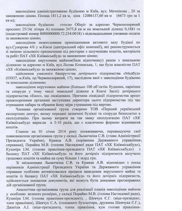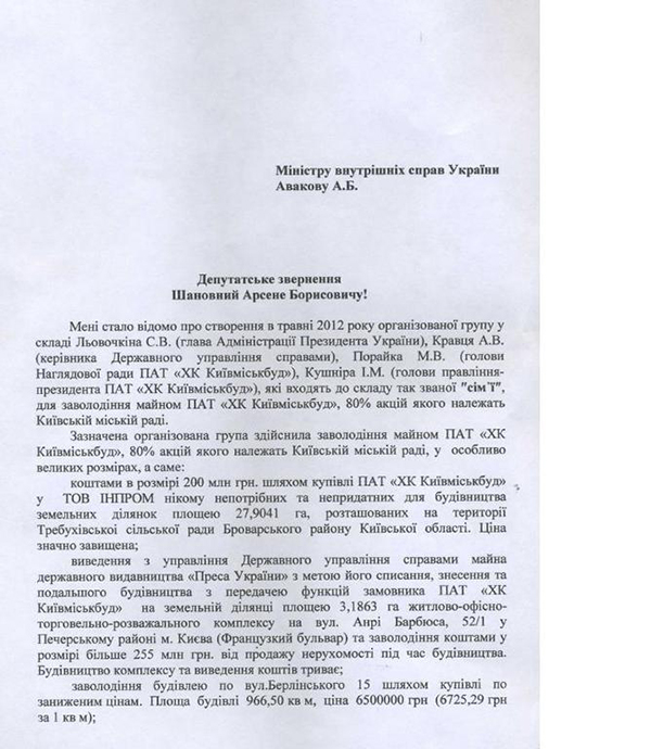 В нем нардеп пишет, что ему стало известно «о создании в мае 2012 года организованной группы в составе Левочкина С.В. (глава Администрации Президента Украины), Кравца А.В. (руководитель Государственного управления делами), Порайко Н.В. (глава наблюдательного совета ПАО „ХК Киевгострой“), Кушнира И.Н. (главы правления — президента ПАО „ХК Киевгострой“, 80% акций которого принадлежат Киевскому городскому совету). Данная организованная группа совершила завладение имуществом ПАО „ХК Киевгострой“ в особо больших размерах».
