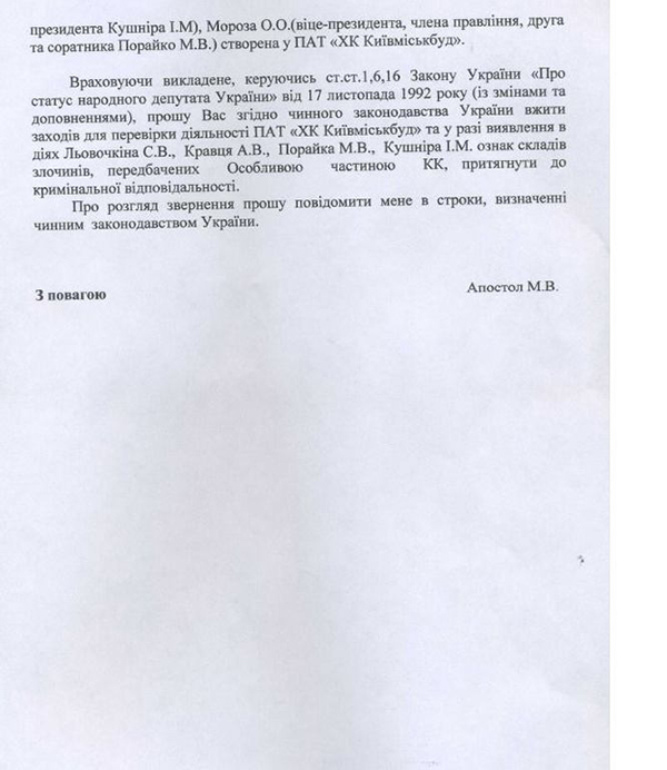 Учитывая все приведенные факты, Михаил Апостол просит Авакова принять меры для проверки деятельности «Киевгорстроя» и в случае подтверждения незаконных действий привлечь к ответственности Левочкина, Кравца, Порайко и Кушнира.