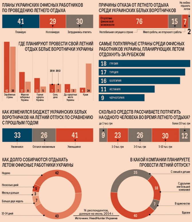 Лишь четверо из десяти (41 %) украинских белых воротничков решительно настроены летом отдохнуть от изматывающих трудовых будней. Треть (29 %) офисных работников нашей страны вынуждены отказаться от летнего отпуска, а еще столько же (30 %) по‑прежнему не определились со своими планами на текущий летний сезон. Об этом свидетельствуют результаты исследования, проведенного в июне 2014 г. международным кадровым порталом «HeadHunter Украина».