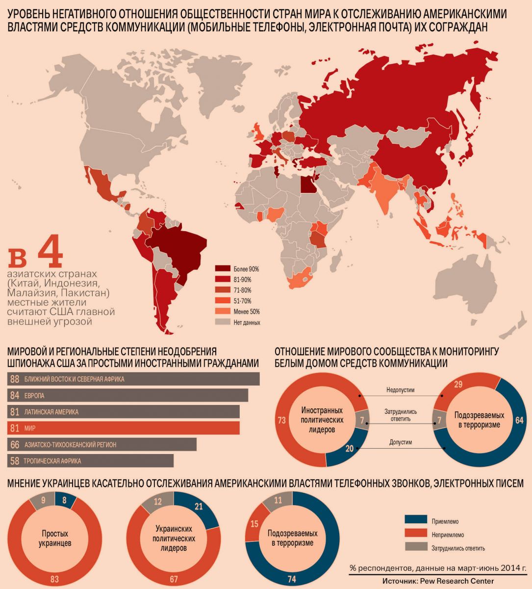 Таковы результаты исследования общественного мнения, проведенного с марта по июнь 2014 г. американским аналитическим центром Pew Research Center. Информацией для анализа послужили итоги опроса около 48 тыс. жителей мира, представляющих 43 государства. Цель исследования — изучить отношение населения планеты к глобальному коммуникационному шпионажу Белого дома.