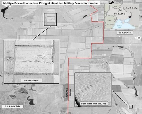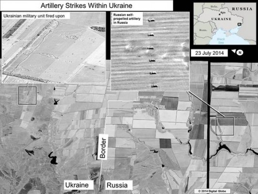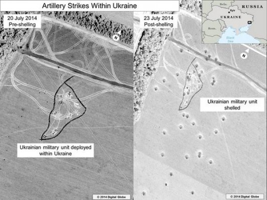 Посол США в Украиние Деффри Пайетт выложил в свой аккаунт на Twitter фотографии со спутника, доказывающие, по его словам, что Россия ведет обстрел украинской территории через границу.