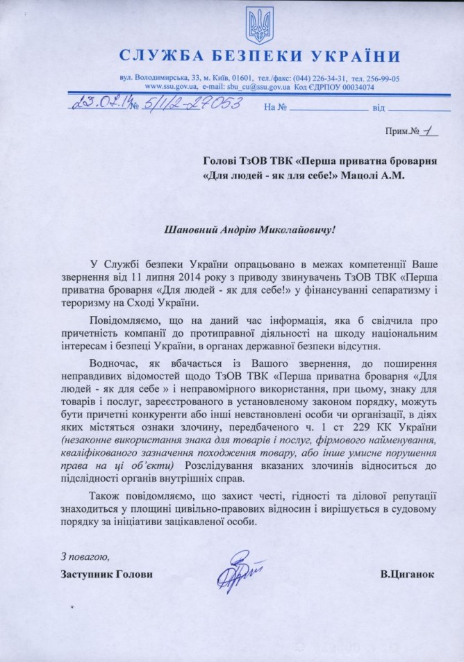 Служба безопасности Украины завершила проверку ООО ТПК «Перша приватна броварня» и выдала решение о непричастности компании к финансированию сепаратистской и террористической деятельности на Востоке Украины.