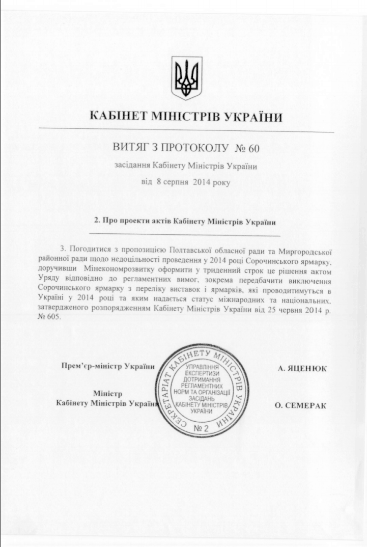 Кабинет министров принял решение отменить в текущем году проведение Сорочинской ярмарки в Полтавской области. Об этом сообщает пресс-служба Полтавского областного совета со ссылкой на протокол № 60 заседания Кабинета Министров Украины от 8 августа (на фото внизу).