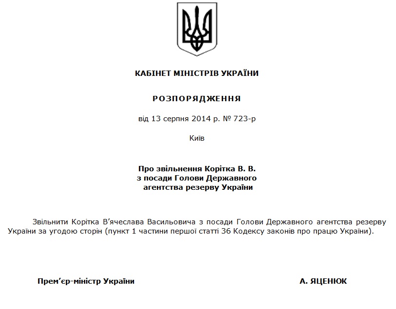 Премьер-министр Арсений Яценюк уволил с должности председателя Государственного агентства резерва Украины Вячеслава Коритко. Об этом говорится в его распоряжении от 13 августа №723-р, размещенном на сайте Кабмина.