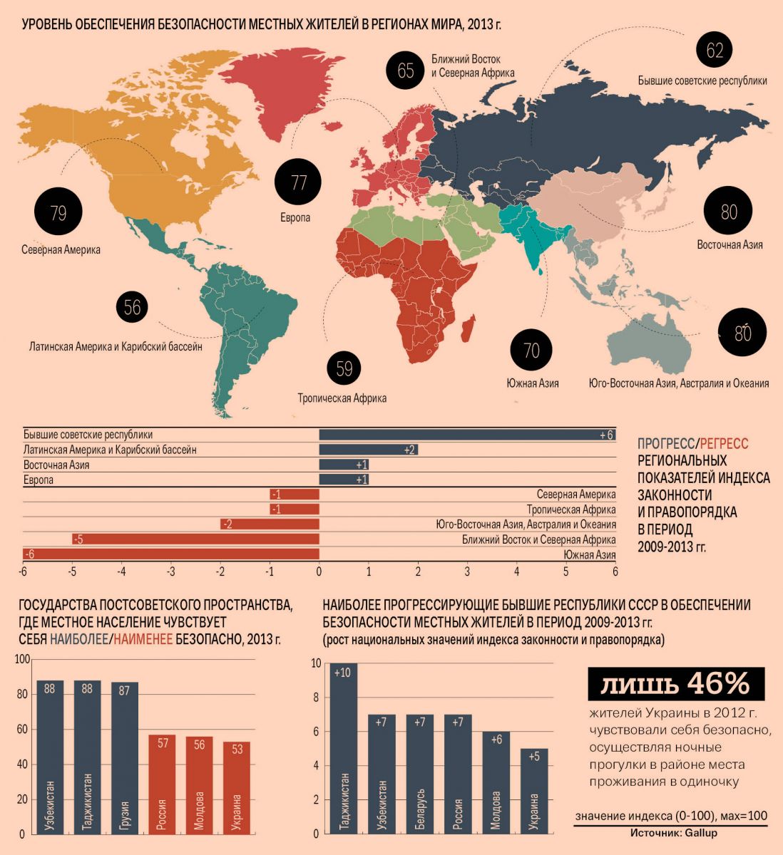 Несмотря на определенный прогресс, наша страна по‑прежнему демонстрирует худшие результаты по уровню обеспечения безопасности местного населения среди 12 бывших советских республик. Таковы результаты исследования восприятия жителями государств мира степени собственной защищенности, проведенного в 2009 и 2013 гг. международной исследовательской компанией Gallup. Информацией для анализа послужили результаты опроса 1 тыс. жителей не моложе 15 лет в каждой из исследуемых стран.