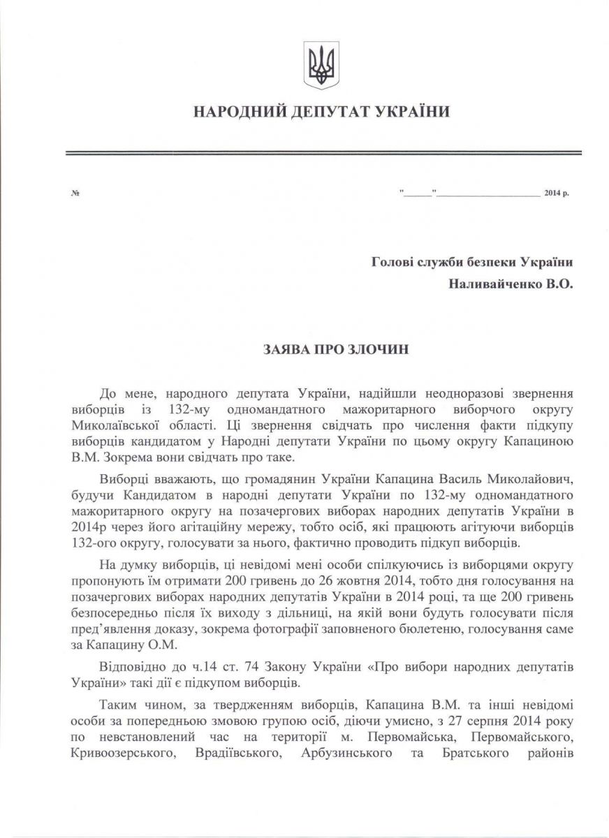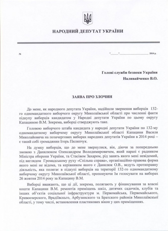 По утверждению Павловского, группа лиц, а именно руководитель избирательного штаба кандидата по 132 округу Василия Капацины — Игорь Пилипчук, советник министра обороны Александр Данилюк и гражданин Захар Стасив (все имеют отношение к организации «Общее дело») ведут противоправную деятельность - в частности, подкупают избирателей на территории 132 округа, предлагая им проголосовать на выборах 26 октября за Капацину.