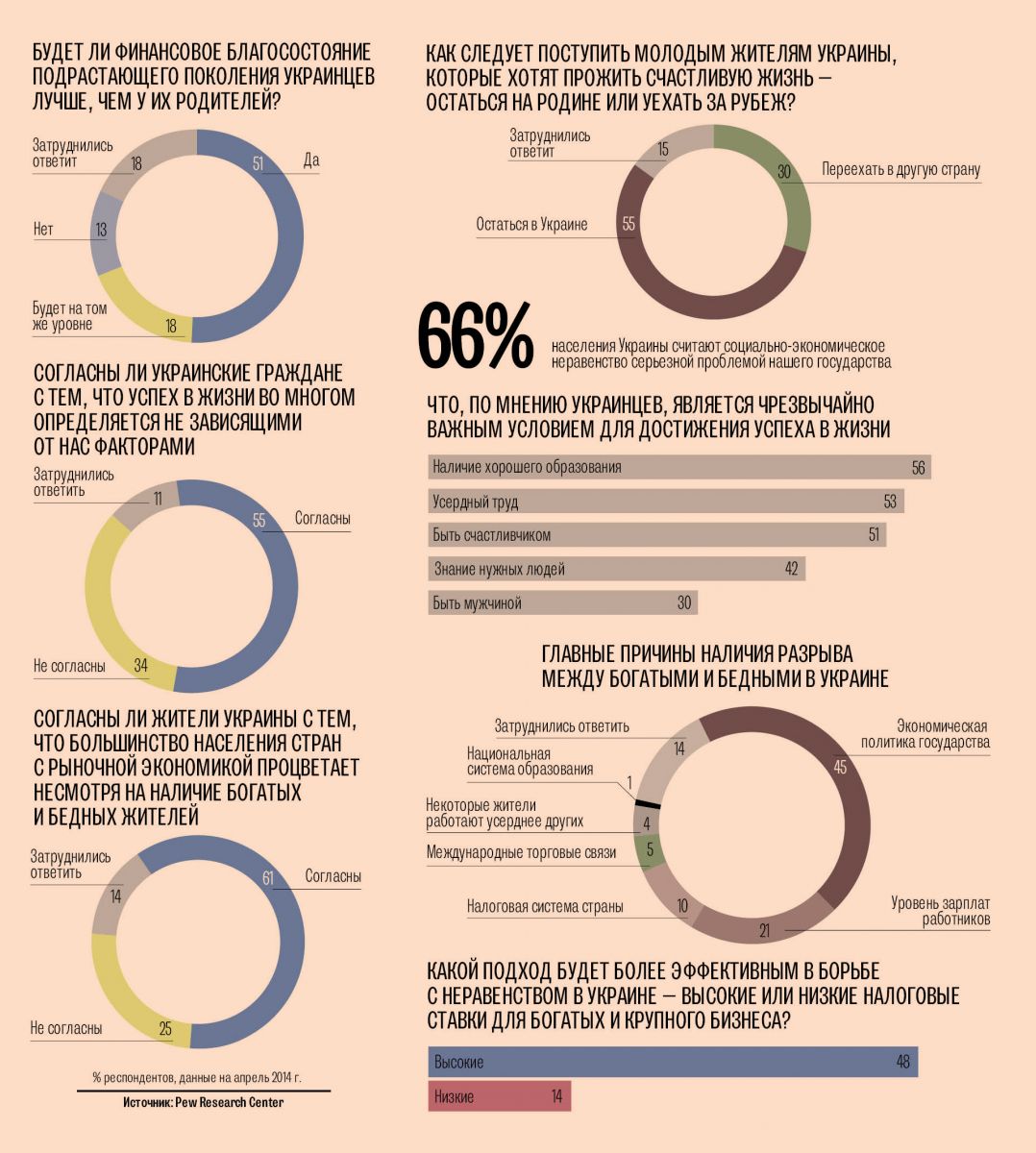 По оценкам экспертов Pew Research Center, более половины (55 %) наших сограждан советуют молодым украинцам, желающим прожить счастливую жизнь, оставаться на родине, тогда как меньше трети (30 %) рекомендуют переехать в другую страну. Главным условием достижения жизненных целей 56 % населения Украины называют наличие хорошего образования. Не менее важными факторами успеха в жизни украинцы считают трудолюбие (53 % опрошенных) и благосклонность Фортуны (51 %). Вместе с тем, 55 % соотечественников настаивают на том, что жизненное благополучие во многом определяется не зависящими от нас факторами.