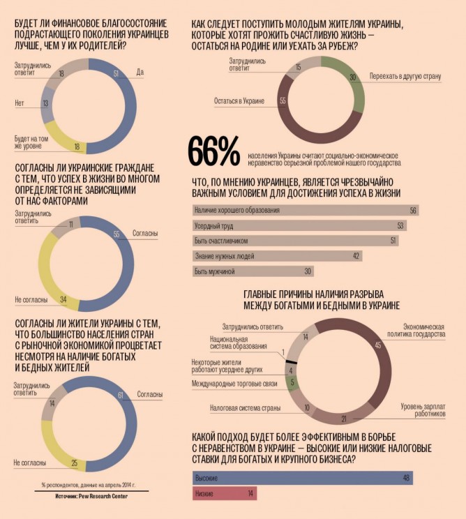 Что касается социально-экономического неравенства, 66 % украинского населения считают его серьезной национальной проблемой. А главным виновником наличия громадного разрыва между богатыми и бедными 45 % респондентов называют экономическую политику государства. Около половины (48 %) опрошенных полагают, что высокие налоги для украинских олигархов и крупных предприятий с целью финансирования программ помощи бедным могут способствовать эффективной борьбе с неравенством в Украине.