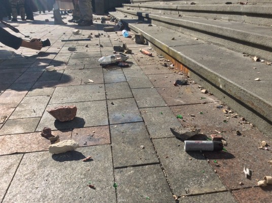 Демонстранты в количестве до 200 человек под знаменами «Свободы», скандирующие «Слава Украине!», а также под гимн Украины начали забрасывать Раду и кордоны силовиков шумовыми гранатами.