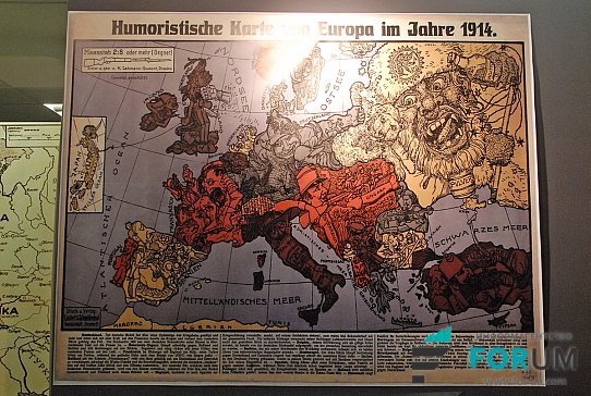 Но и на войне есть место шутке — на выставке есть также и юмористические карты Европы начала ХХ века.