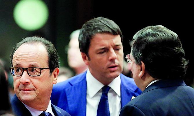 Маттео Ренци буквально заглядывает в рот Жозе Мануэлу Баррозу. А Франсуа Олланд придерживается других взглядов