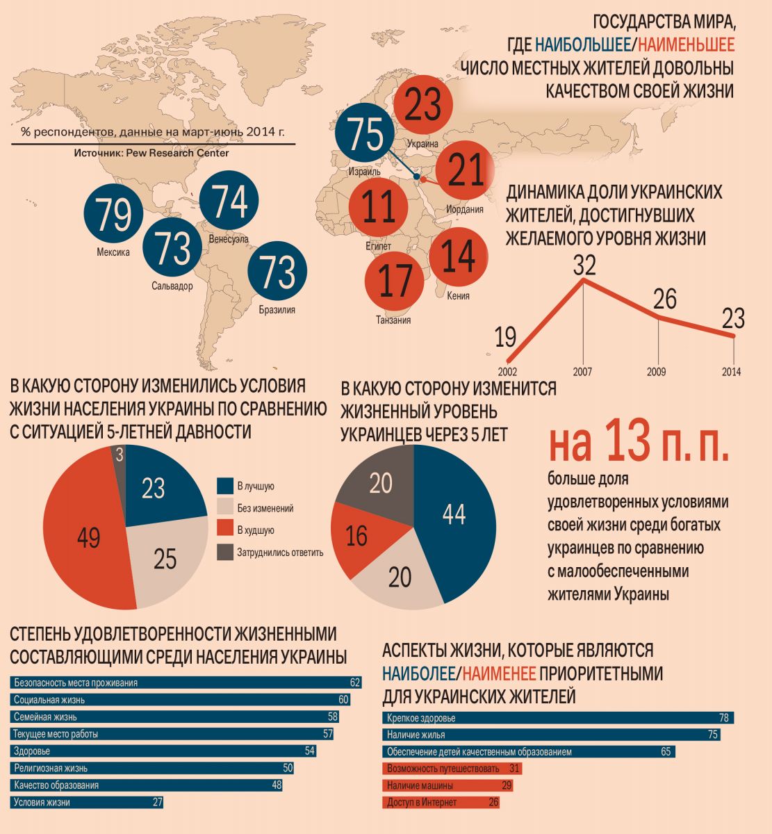 По подсчетам экспертов Pew Research Center, больше всех удовлетворены своей жизнью жители Мексики — четверо из пяти (79 %) ее граждан достигли желаемого жизненного комфорта. В числе наиболее счастливых оказались также жители Израиля (75 % опрошенных) и трех латиноамериканских государств — Венесуэлы (74 %), Бразилии (73 %) и Сальвадора (66 %). С другой стороны, в пятерке наименее удовлетворенных наций планеты, кроме украинцев, оказались исключительно представители Ближнего Востока и Африки — иорданцы (21 %), танзанийцы (17 %), кенийцы (14 %) и египтяне (11 %).
