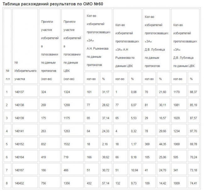 При этом, согласно информации, указанной на стр. 11 протокола ОИК, на участке № 140137 за кандидата в народные депутаты Рыженкова А.Н. проголосовал 1 избиратель, а за Лубенца Д.В. — 1170. Однако, согласно экземпляру протокола участковой избирательной комиссии № 140137 о подсчёте голосов на избирательном участке, полученного по завершению итогового заседания этой комиссии, за кандидата в народные депутаты Рыженкова А.Н. проголосовал 101 избиратель, а за Лубенца Д.В. — 70. Такая же ситуация наблюдается по остальным участкам округа.