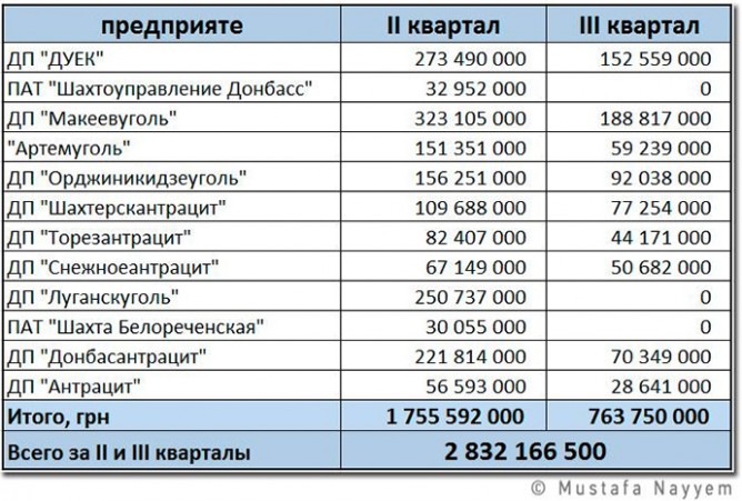 Во втором и третьем кварталах 2014 года украинские власти перечислили почти 3 млрд грн предприятиям угольной промышленности, которые находятся на оккупированных боевиками территориях Луганской и Донецкой областей.