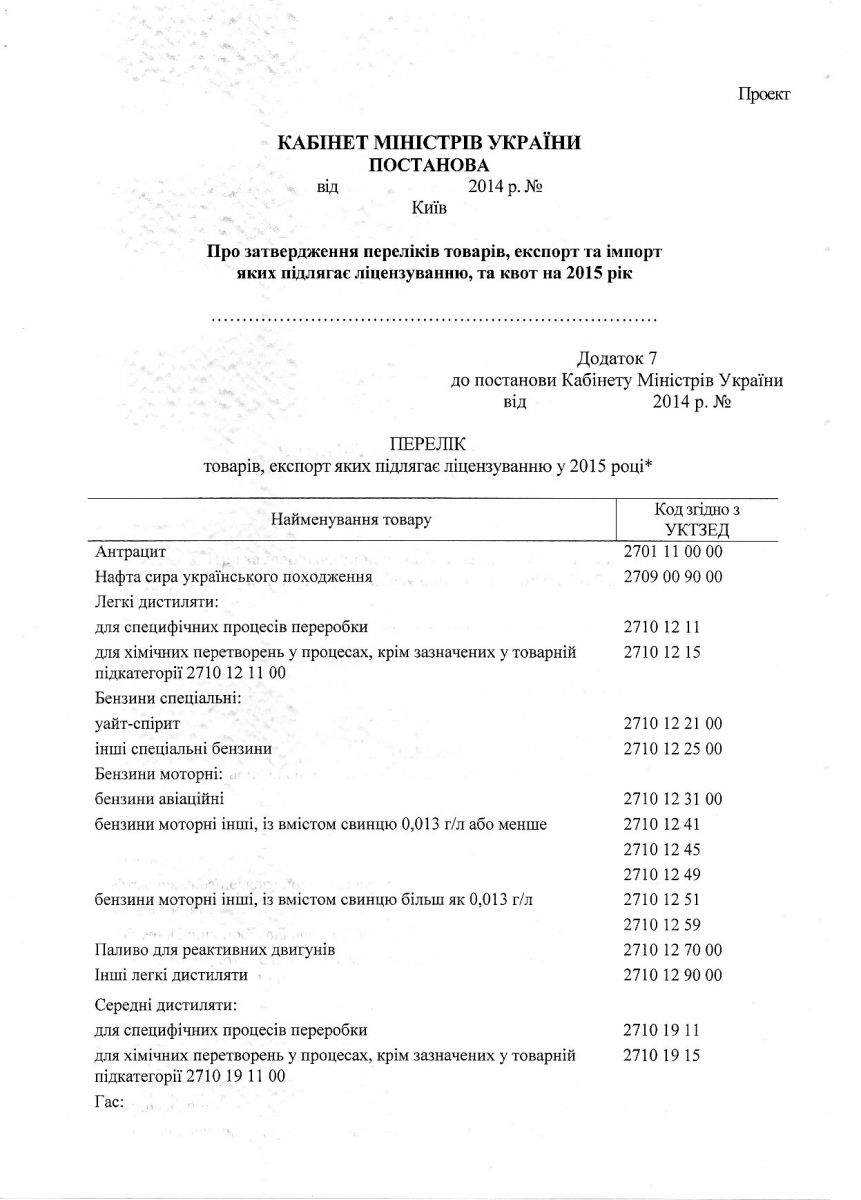 Кабинет министров Украины планирует в 2015 году ввести обязательное лицензирование экспорта нефти и нефтепродуктов. Об сообщает OilNews со ссылкой на проект постановления правительства.