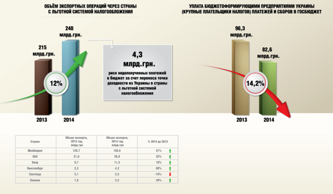 Экс-министр обращает внимание на тот факт, что крупные налогоплательщики по итогам 2014 года снизили уплату основных налогов на 13,7 млрд грн, но вместе с тем увеличили экспорт в страны с льготным налогообложением на 25 млрд грн, или на 12% по сравнению с прошлым годом.