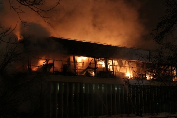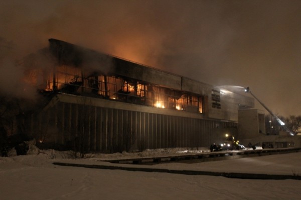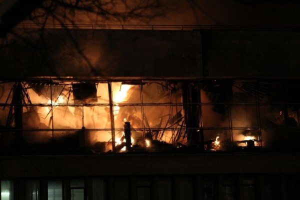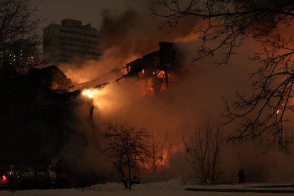 Сообщение о пожаре на последнем этаже трехэтажного здания поступило в пятницу поздно вечером. Площадь пожара, по предварительным данным МЧС, составляет около 2 тыс. кв. м. В здании обрушилась кровля на площади около 1 тыс. кв. м.