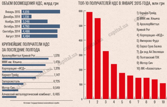 В январе более чем по 500 млн грн получили компании Андрея Веревского Кернел-Трейд и мариупольский меткомбинат им. Ильича, входящий в группу Метинвест Рината Ахметова. Это позволило предприятиям взобраться в топ-5 компаний, получивших возмещение за последние полгода. Возглавляет этот условный рейтинг металлургический гигант АрселорМиттал Кривой Рог. Получив в январе 325,1 млн грн, компания закрепилась на позиции лидера по итогам полугодия. С августа 2014 года по январь 2015 года органы госказначейства перечислили предприятию 1,578 млрд грн.