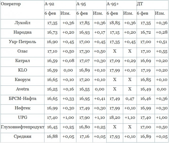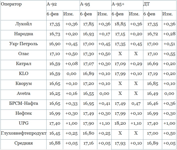 6 февраля цены в сетях АЗС «ЛУКОЙЛ», «БРСМ-Нафта», «Укр-Петроль» и UPG повысили на все виды топлива выросли на 0,36-1,10 грн/л. Об этом сообщает OilNews со ссылкой на «Консалтинговую группу А-95».
