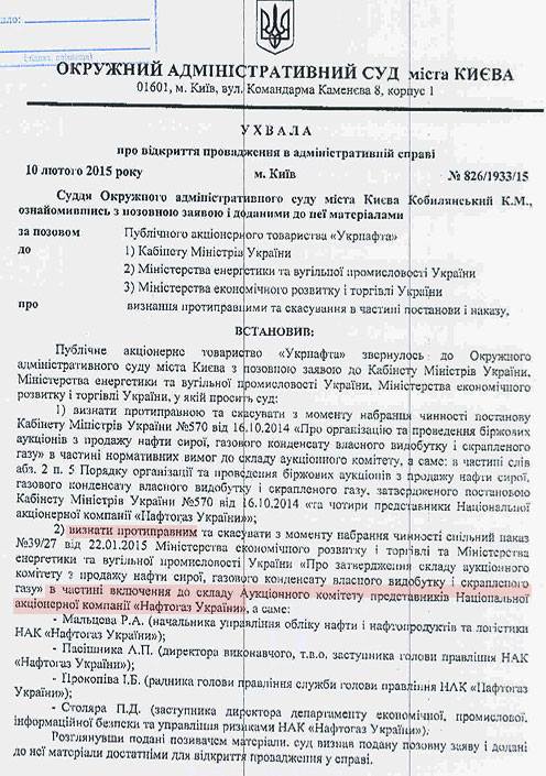 Компания «Укрнафта» подала в Окружной административный суд Киева иск, в котором требует исключить из состава Аукционного комитета по продаже нефти, газового конденсата собственной добычи и сжиженного газа четырех представителей одного из своих акционеров — НАК «Нафтогаз Украины».