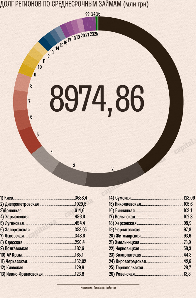 Не получая среднесрочных кредитов от Министерства финансов, города практически ничего не выплачивали по старым долгам. За год Госказначейство получило всего 33,6 млн грн в счет погашения задолженности. Ни копейки по своим долгам не заплатил Киев, который является основным должником по среднесрочным займам. На столицу приходится больше трети всего долга — 3,6 млрд грн.
