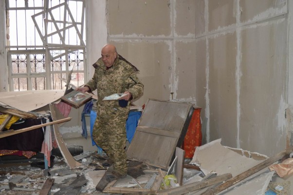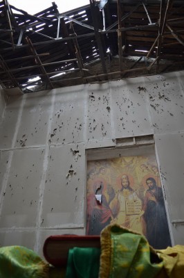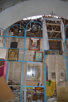 «Боевики разбили каменную православную церковь, построенную еще в 1840 году. Вокруг церкви множество воронок от обстрелов, а некоторые снаряды попали прямо в здание, пробили крышу и взорвались внутри. Алтарь полностью разбит, иконы побиты осколками, священные книги валяются на земле», — рассказывает Москаль.