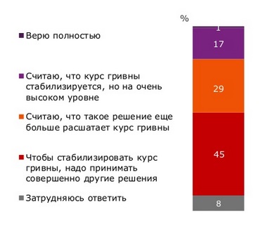 При этом 17% опрошенных верят, что политика гибкого курса приведет к стабилизации национальной валюты, но на очень высоком уровне.