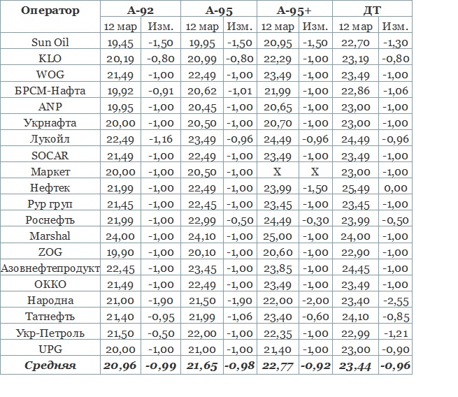 11 марта крупнейшие операторы в среднем скинули по 1 грн/л на бензины и ДТ.