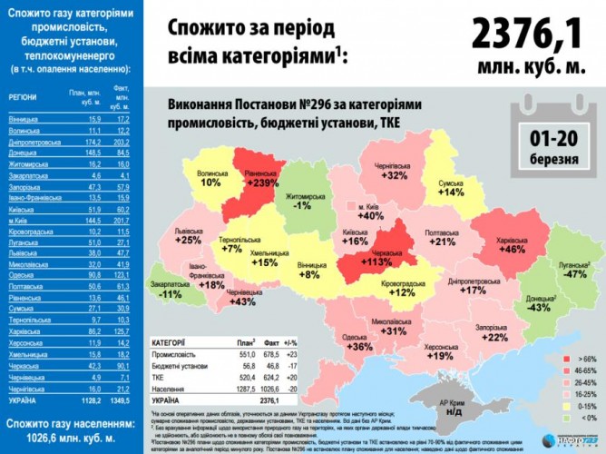 При этом потребители Украины, для которых правительство установило лимиты использования природного газа (промышленность, ТКЭ, бюджетные учреждения) превысили эти лимиты на 20% (по итогам февраля 2015 г. превышение составило около 12%). Указанные категории использовали 1349,5 млн куб. м газа при запланированном объеме 1128,2 млн куб. м (факт прошлого года — 1600,8 млн куб. м).