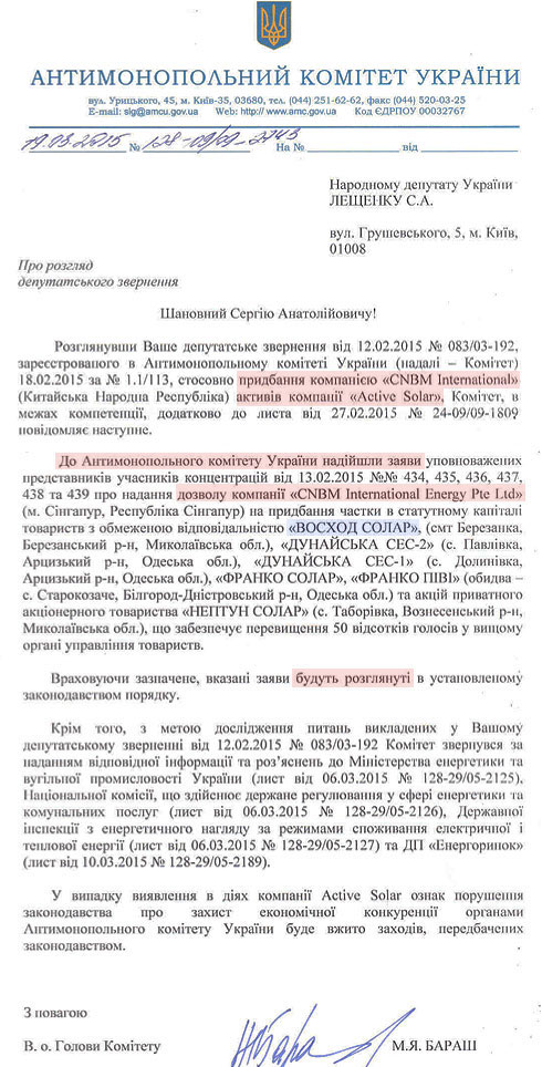Об этом говорится в ответе АМКУ на запрос нардепа из БПП Сергея Лещенко, который нардеп опубликовал в своем блоге.