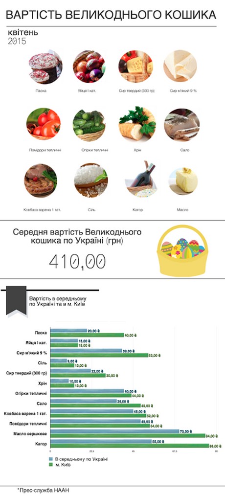 Средняя стоимость праздничной пасхальной корзины для украинцев в 2015 году составит 410 гривен, свидетельствуют данные Национальной академии аграрных наук Украины и ННЦ «Институт аграрной экономики».