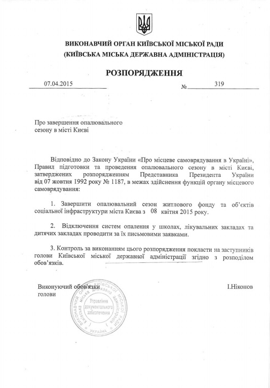 «Завершить отопительный сезон жилого фонда и объектов социальной инфраструктуры города Киева с 8 апреля 2015 года», — говорится в распоряжении ведомства № 319.