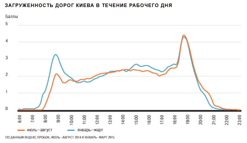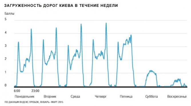 В будни в Киеве заметны часы пик: утром с 8:30 до 9:30 и вечером с 18:00 до 19:00, причем вечером загруженность обычно заметно выше, чем утром. Летом утренний час пик почти пропадает, но вечерний остается на том же уровне.