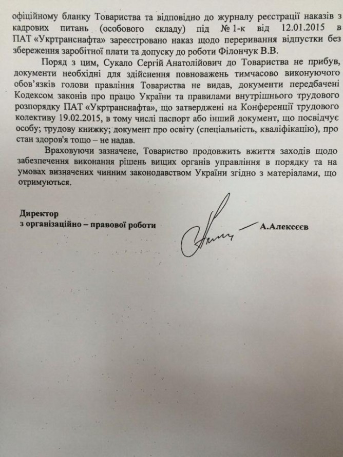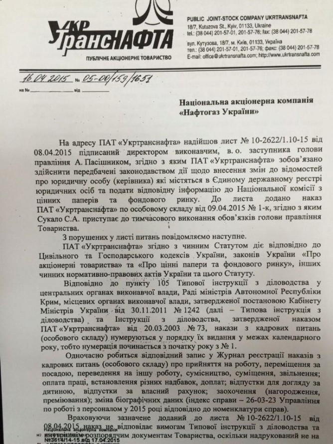 Свидетельством тому является письмо «Укртранснафты» в адрес НАК «Нафтогаз Украины» (на фото внизу). В нем «Укртранснафта» утверждает, что Сукало не прибыл в центральный офис компании и не предоставил необходимых документов для осуществления своих полномочий.