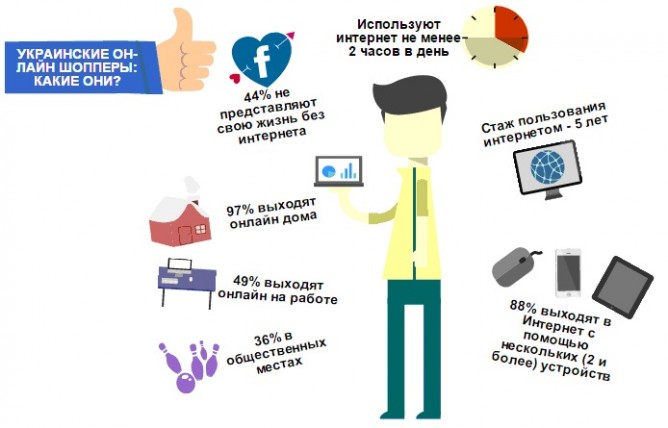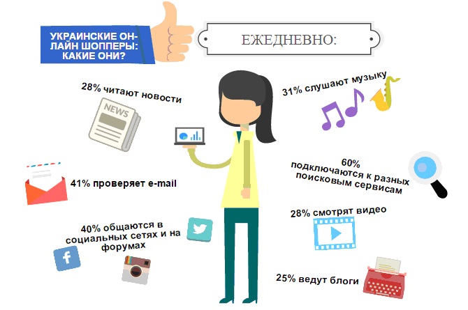 Согласно данных исследования компании TNS, для украинского онлайн шоппера важно качество обслуживания: 79% могут отказаться от покупки в интернет-магазине из-за плохого обслуживания и избегать этот магазин в дальнейшем. Также они ценят и любят инновации: 77% хотят быть первыми, кто использует новые технологии. Не стоит забывать, что любой потребитель любит скидки и акции — 61% онлайн покупателей стараются использовать рекламные купоны, дающие скидку.