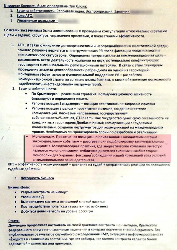 По его данным, документ был разработан под руководством гендиректора ДТЭК Максима Тимченко и получил название «Крепость», передает «Апостроф».