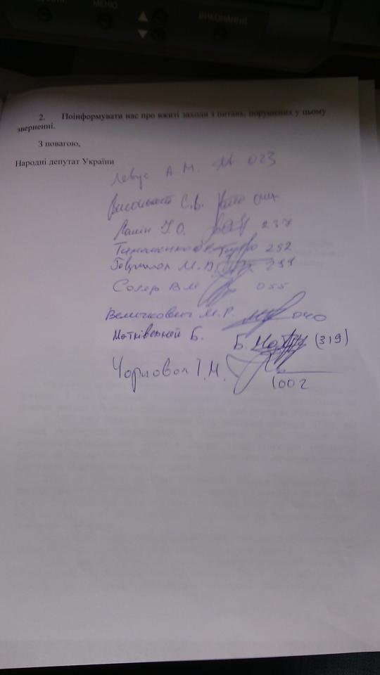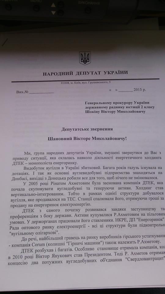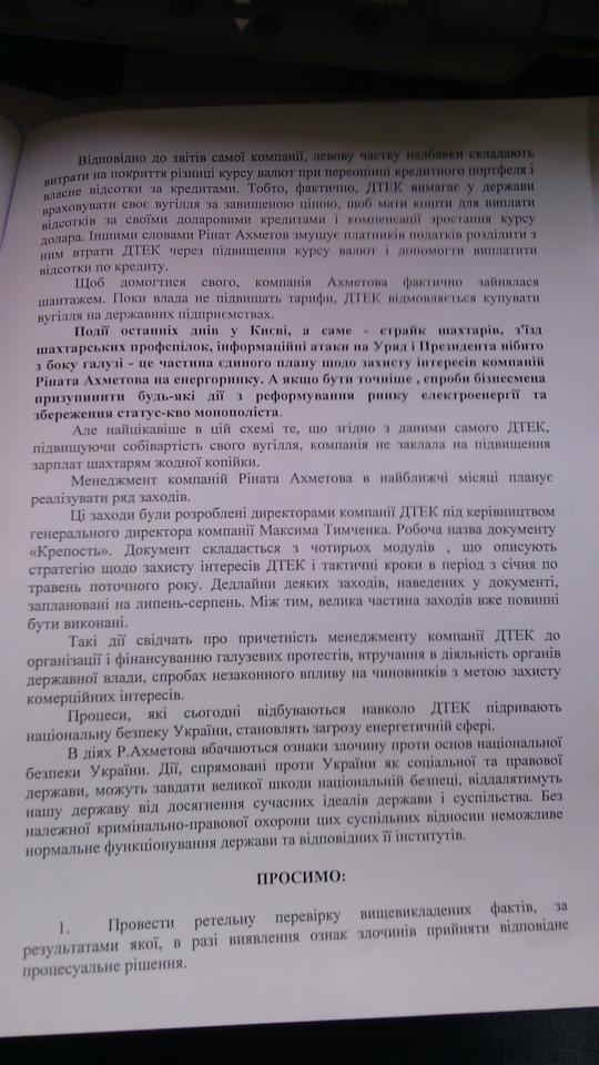 «Итак. Отправляем с коллегами обращение на имя генерального прокурора с требованием разобраться в том безобразии, которое Ахметов вчера устроил в Киеве. Шантаж государства свезенными околошахтерами и титушками, тем более, во время войны — фактическая помощь России в дестабилизации обстановки в нашей стране. Все это должно повлечь за собой ответственность», — написал он и приложил фото обращения.