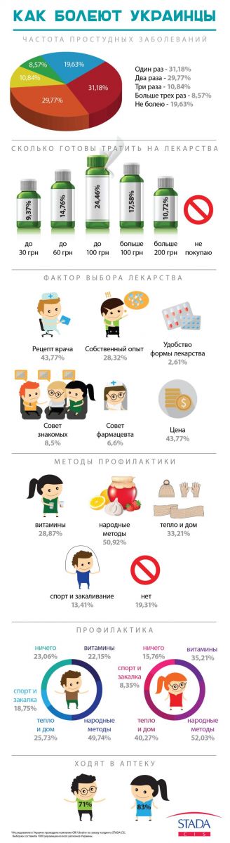Кроме того, исследование показало, что уровень заболеваемости простудой среди населения вырос по сравнению с 2013 годом: в 2014 году 80% жителей Украины хотя бы раз за сезон перенесли ОРЗ или ОРВИ, при этом 31% украинцев болели один раз и только 20% — не болели совсем. Годом ранее лечиться от простуды были вынуждены 70% украинцев, а ни разу не болели за осенне-зимний период 30%.