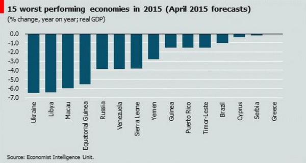 The Economist сравнил страны по динамике ВВП. Так, за год с апреля 2014 года экономика Украины сократилась на 6,5%. На втором месте Ливия с падением 6,4%, на третьем — Макао с −6%, на четвертом — Экваториальная Гвинея с −5,5%.