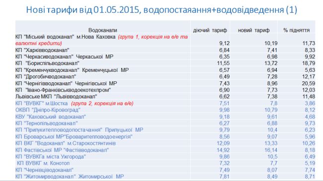 Так, к первой группе относятся водоканалы, в которых повышение тарифов происходит на уровне 5,63% −20,59% из-за роста стоимости электроэнергии и валютных кредитов. Среди таких водоканалов: КП «Городской водоканал» г. Новая Каховка, КП «Харьковводоканал», КП «Черкассыводоканал» Черкасской МГ, КП «Бориспольводоканал», КП «Кременчукводоканал» Кременчугской МГ, КП «Дрогобычводоканал», КП «Черниговводоканал» Черниговского МР, КП «Ивано-Франковскводоэкотехпром», Львовское МКП «Львовводоканал».