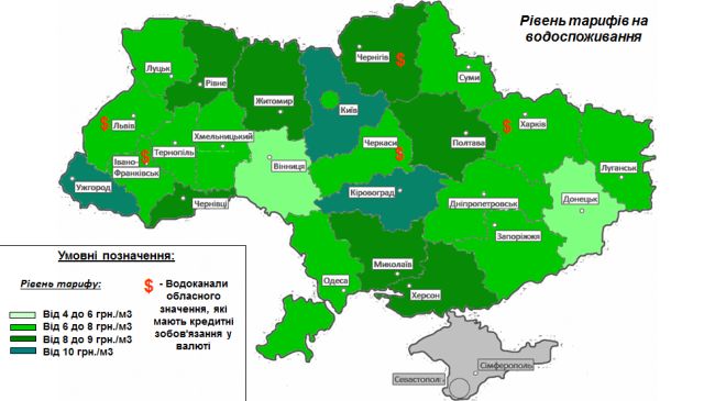 Так, максимальные тарифы на воду будут установлены в Киевской, Закарпатской и Кировоградской области. — от 10 грн за куб. м, в г. Киеве — от 6 до 8 грн за куб. м. Наименьшие тарифы будут в Винницкой и Донецкой обл. — от 4 до 6 грн за куб. м.
