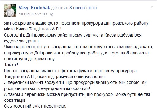 В четверг журналист Василий Кручак выложил в сеть фото переписки трех прокуроров в суде, в ходе которой они обсуждали, что лучше: открыть дело на активиста или просто его побить.