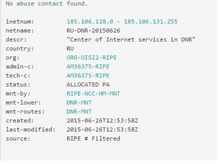 «Центр интернет-поддержки ДНР» находится в Донецке. В регистрации указано, что адреса будут использоваться в зоне RU — Российская Федерация.