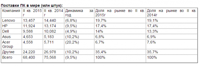 Все пять крупнейших мировых производителей компьютеров во II квартале продемонстрировали сокращение поставок. При этом лидер рынка, китайская Lenovo, отразил снижение показателя впервые со II квартала 2013 года — на 6,8%, до 13,5 млн штук. На динамику поставок компании повлияли операции в Латинской Америке, Японии и в регионе EMEA (Европа, Ближний Восток, Африка).